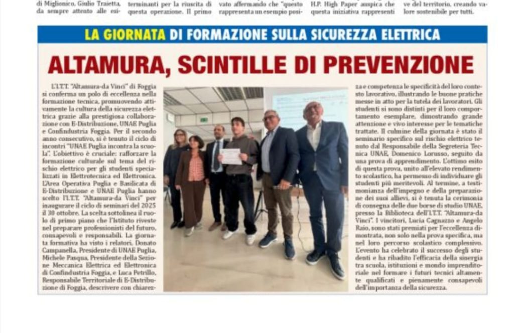 L’I.T.T. “Altamura-da Vinci” di Foggia si conferma un polo di eccellenza nella formazione tecnica, promuovendo attivamente la cultura della sicurezza elettrica grazie alla prestigiosa collaborazione con E-Distribuzione, UNAE Puglia e Confindustria Foggia.
